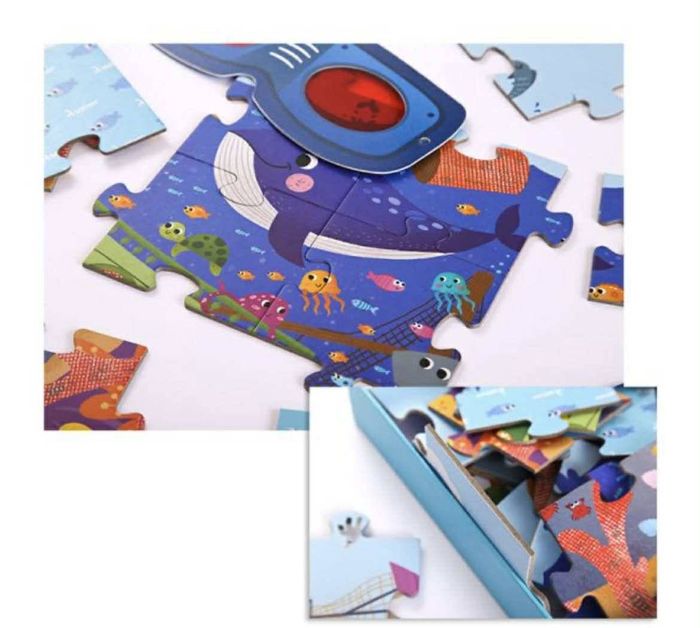 Энэхүү тоглоом нь хүүхдийн анхаарлыг татахуйц 35 ширхэг өнгөт эвлүүлдэг puzzle-тай ба дагалдах өнгөт линз бүхий нүдний шилтэй.